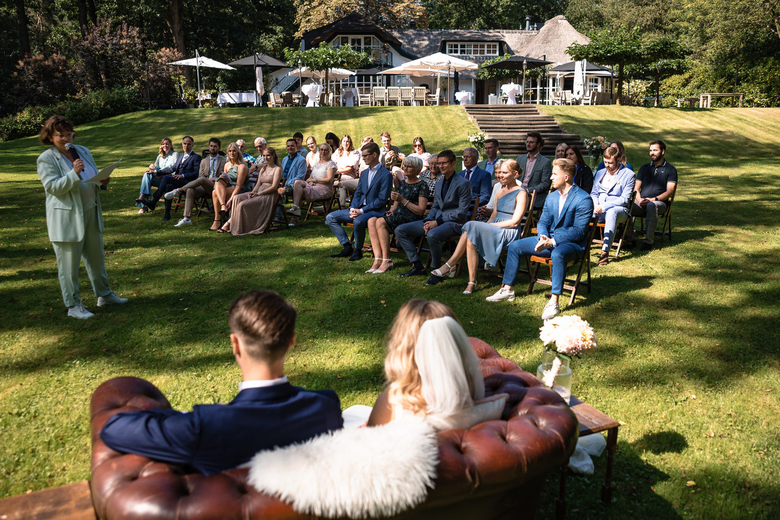We vertrokken naar het koetshuis in Bennekom, waar Wendy's vader haar voor het eerst zag. Daarna maakten ze samen hun entree voor de ceremonie, waar Erwin stralend op haar stond te wachten. De ceremonie werd geleid door Corine, een top ambtenaar van de gemeente de gemeente Ede. Ze had prachtige woorden voor het bruidspaar en de aanwezigen. Deze werden aangevuld door een extra persoonlijke noot van Talitha, dus zus van Wendy. Nadine, de wedding planner, zorgde ervoor dat alles vlekkeloos verliep.