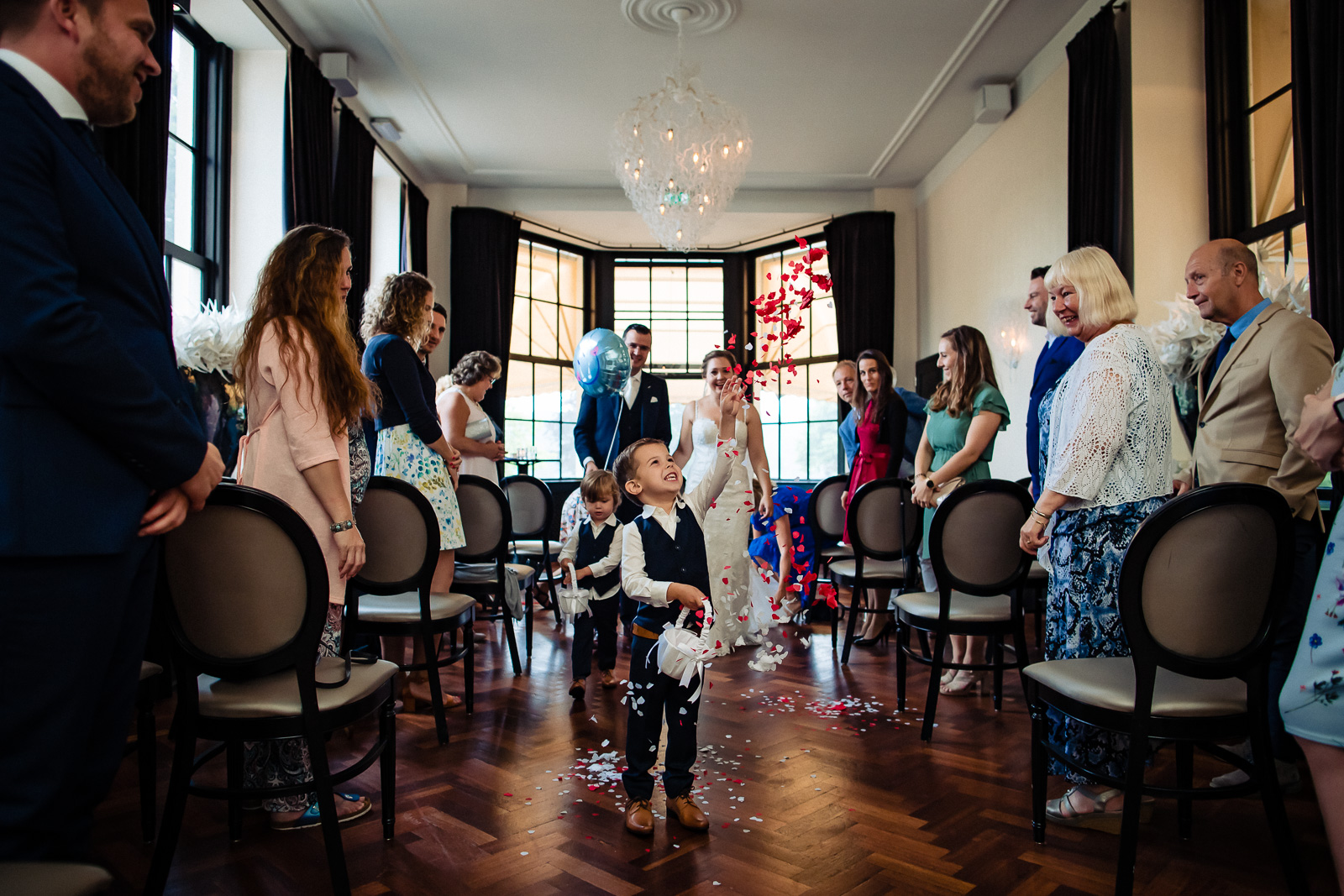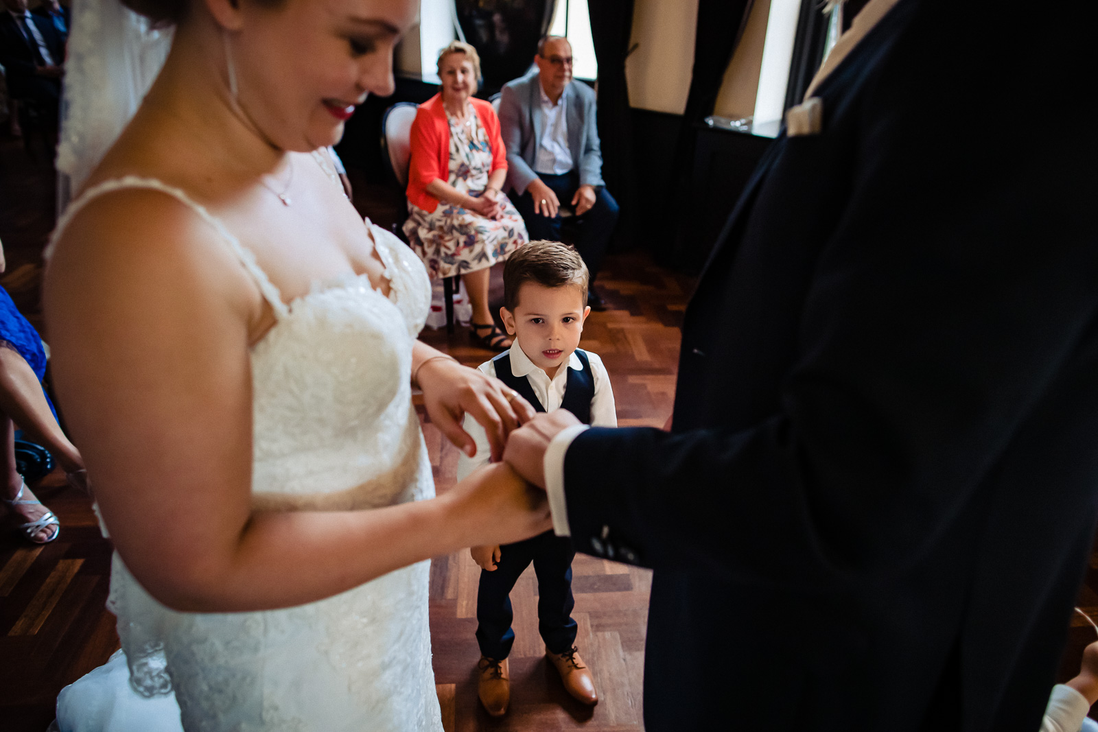 Een van de voordelen van twee fotografen op je bruiloft is de kans op meer en mooie beelden uit verschillende hoeken. Zo kon Robin de bruid met haar vader op de trap fotograferen, waar ik zelf bij Leon en de kids in de buurt bleef. Zo heb je hele verschillende beelden en vertel je nog beter het verhaal van de dag!