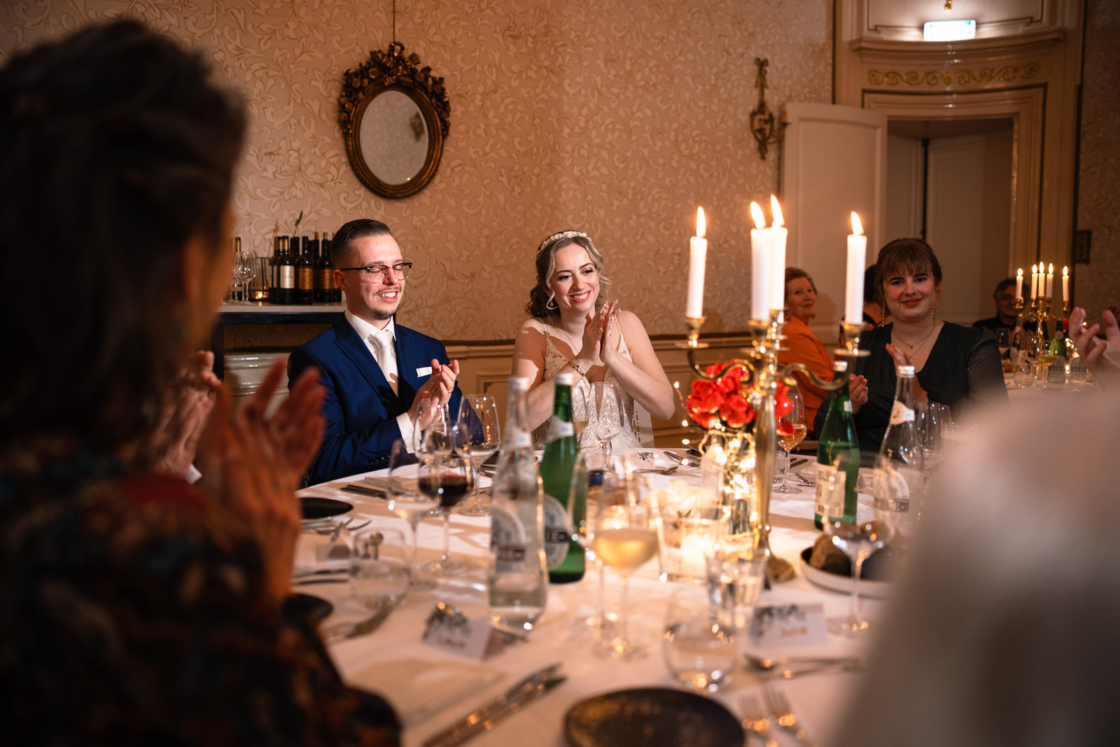 Het diner bracht een serie prachtige speeches met zich mee, vol liefde en humor. De feestavond werd spectaculair geopend met een indrukwekkende openingsdans. Al snel stond iedereen op de dansvloer, genietend van de muziek en het gezelschap. Voor ons eindigde de dag met een paar laatste foto’s bij de kerstbomen in de hal. De warme glimlachen van Michaela en Nander waren de perfecte afsluiting van deze bijzondere dag.