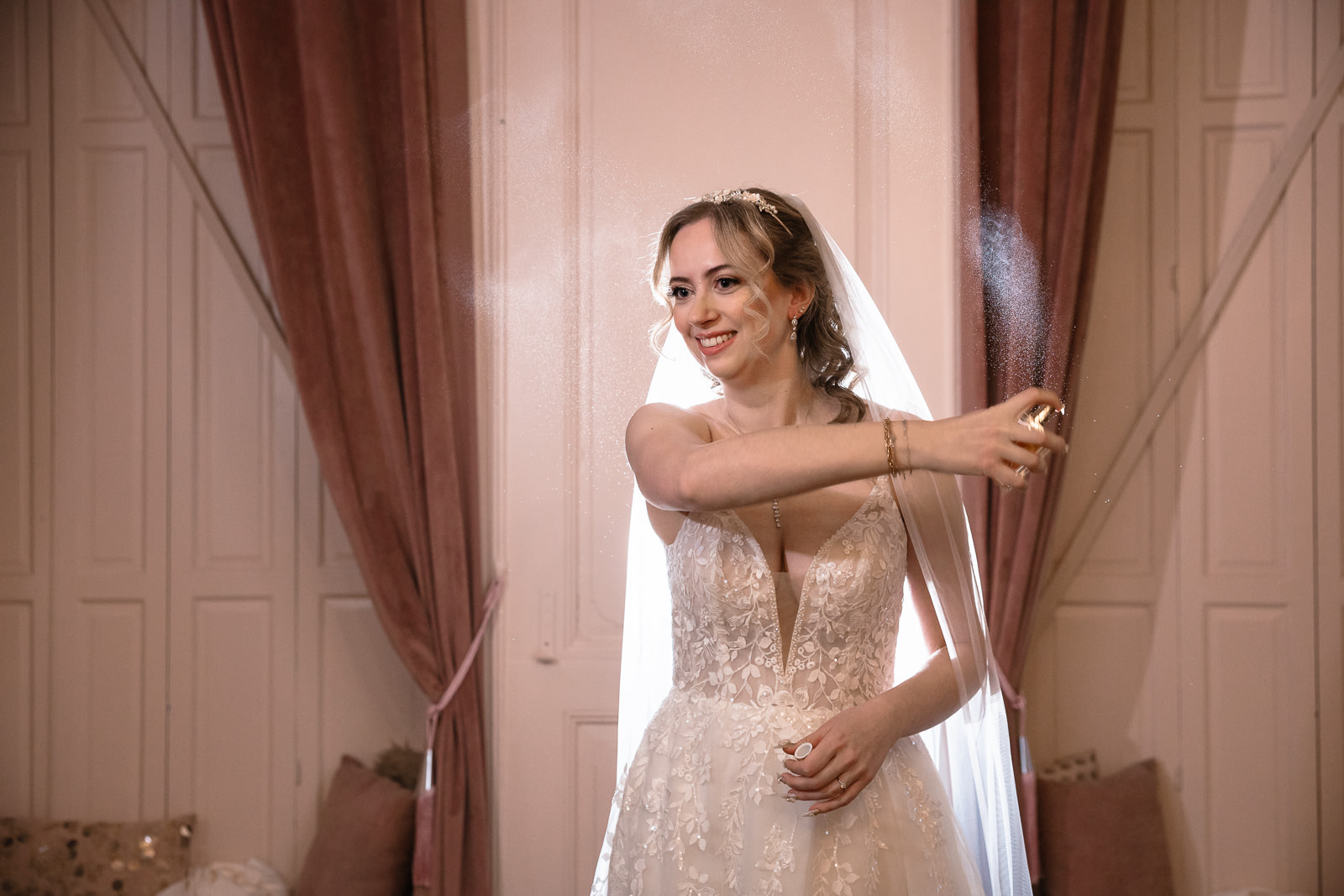 Samen met mijn assistent Naomi arriveerde ik vroeg in de ochtend bij Het Spaansche Hof. De ceremoniemeesters waren al druk bezig met de laatste voorbereidingen, terwijl Michaela zich aan het klaarmaken was in een van de stijlvolle ruimtes van deze iconische locatie. De bruid straalde, omringd door haar naasten en een vleugje opwinding in de lucht. Even later arriveerde Nander. Ook hij genoot van intieme momenten tijdens het aankleden, waarbij we prachtige foto's konden maken die de emotie en spanning van de dag weerspiegelden.