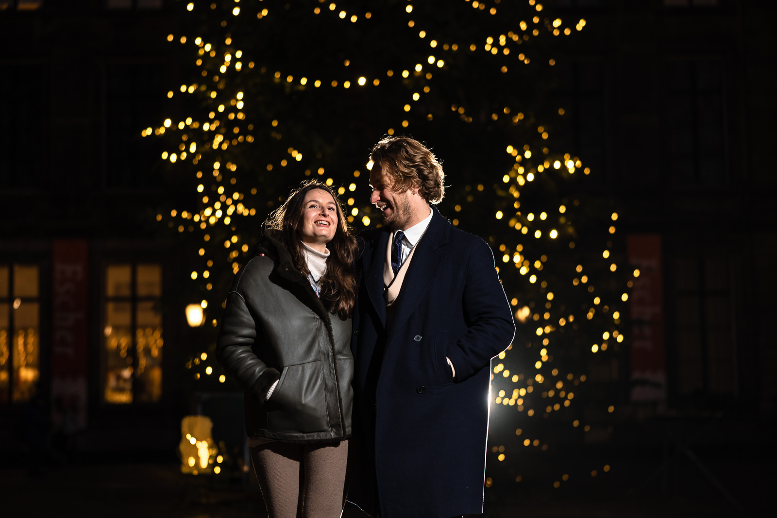 We started the shoot just before sunset to walk around and scout some nice location on the Lange Voorhout. Laetitia glowed in an elegant winter coat with a subtle hint of sparkle, while Kasper looked stylish in a warm wool coat.