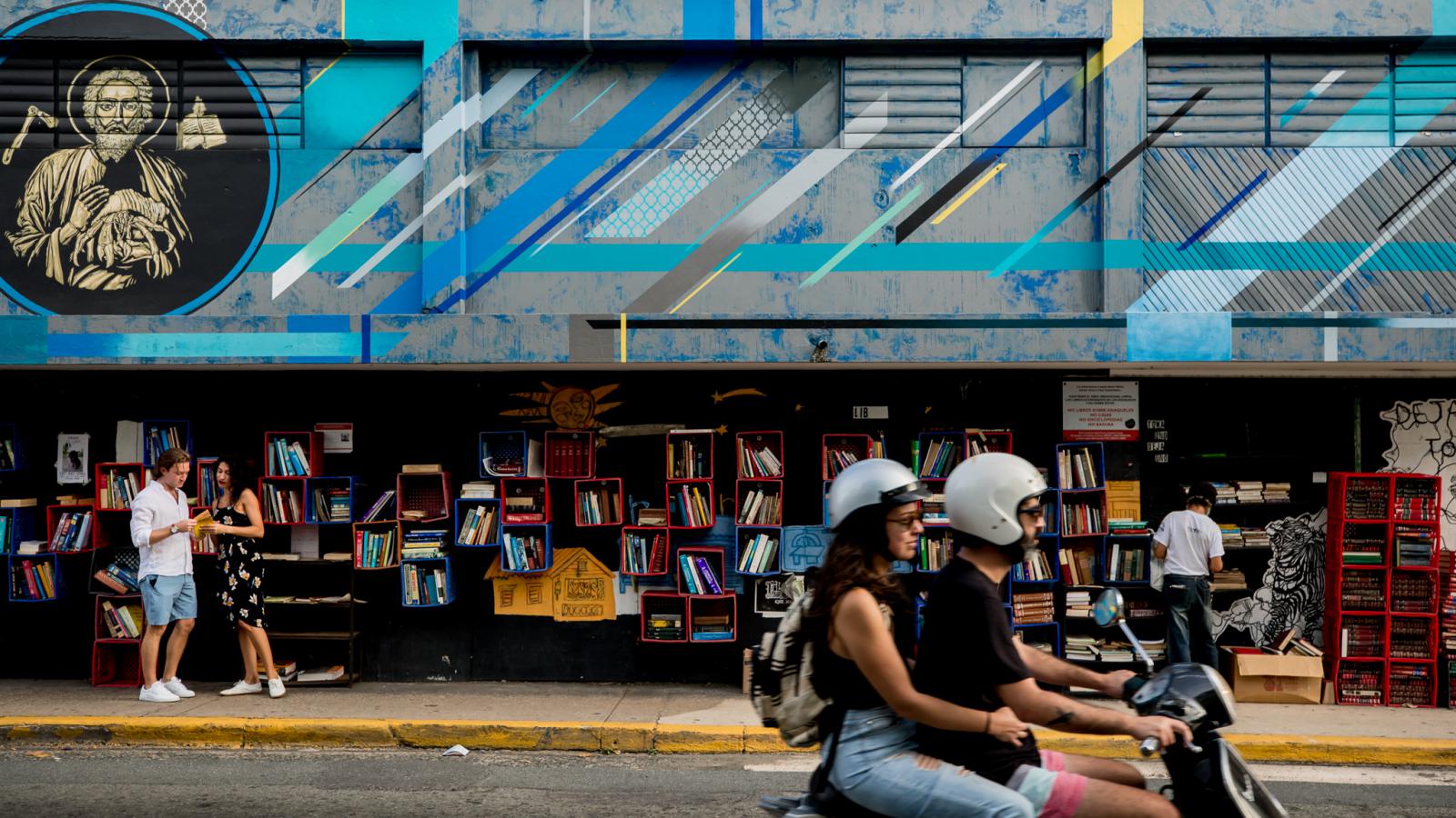 Langs de kant staan in Puerto Rico altijd kleine kraampjes waar iets wordt verkocht. Vers fruit, home cooked meals, bloemen en in dit geval oude boeken. Een stand waar ze regelmatig oude boeken halen om lekker op het strand te kunnen lezen. Supergaaf om het stadse leven in terug te laten komen in de foto’s terwijl zij gewoon hun eigen ding doen.